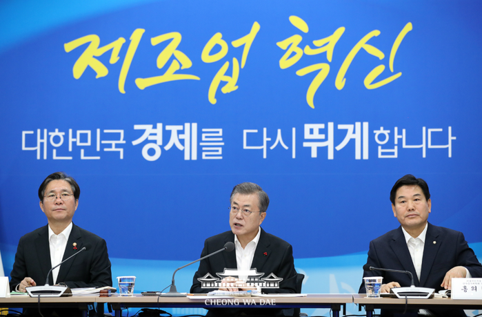 ▲문재인 대통령이 18일 오전 정부세종청사 산업통상자원부에서 ‘제조업 활력회복과 혁신’이라는 주제로 2019년도 산업통상자원부 업무보고를 받기 앞서 인사말을 하고 있다. 왼쪽은 성윤모 산업통상자원부 장관. 오른쪽은 홍의락 국회 산업통상자원중소벤처기업위원회 민주당 간사.(청와대 제공) |