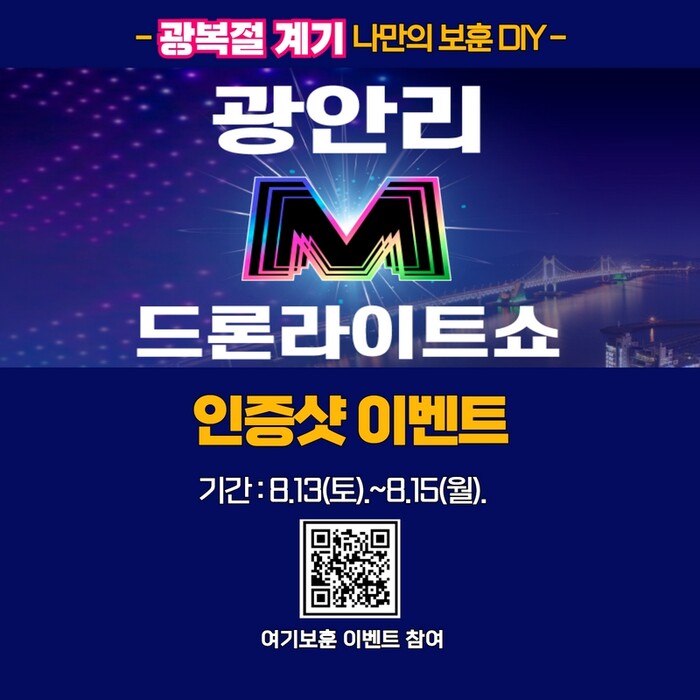 이번 이벤트는 제77주년 광복절을 계기로 500대의 드론이 환상적인 퍼포먼스를 펼치는 ‘광안리 M 드론라이트쇼’와 연계해서 진행될 예정이다. 드론라이트쇼 인증샷 이벤트와 함께 현장에서 푸짐한 기념품도 제공한다.