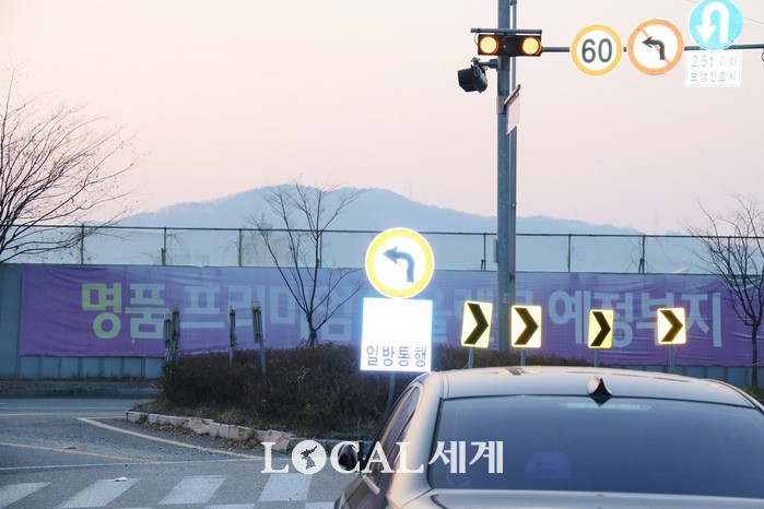 ▲대덕테크노밸리 관광휴양시설용지 가림막에 명품프리미엄 아울렛 예정부지라는 현수막이 걸려있다. 오영균 기자. |