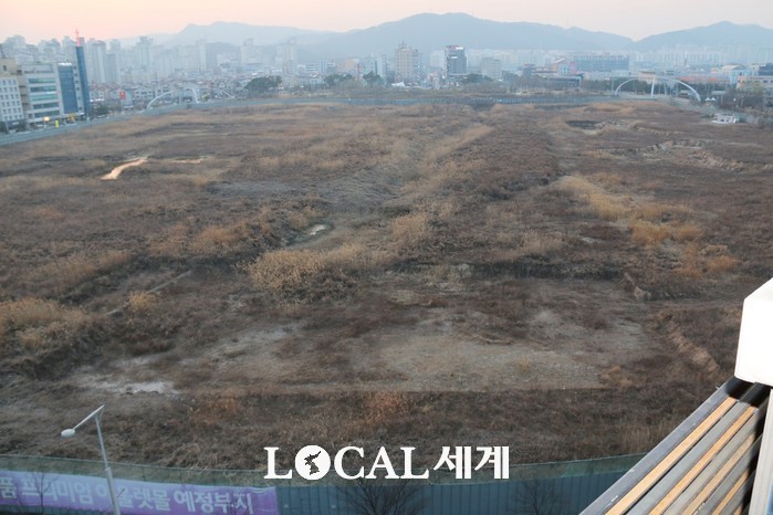▲대덕테크노밸리 관광휴양시설용지 전경. 당초 지구단위계획에는 단지 중앙부인 이곳에 관광·휴양시설인 호텔, 컨벤션센터 등을 조성해 랜드마크 기능을 하도록 계획됐다. 오영균 기자. |