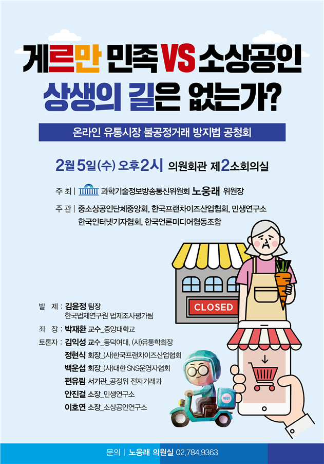 [로컬세계 임종환 기자]한국인터넷기자협회는 국회 과학기술정보방송통신위원회 위원장 노웅래 국회의원(더불어민주당, 서울 마포갑)과 함께 오는 5일 오후 2시 국회 의원회관 제2소회의실에서 온라인 유통시장 불공정거래 방지법 개정을 위한 “게르만 민족 vs. 소상공인, 상생의 길은 없는가?” 공청회를 개최한다.