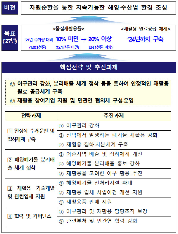 이는 2024년까지 해양폐기물 전처리부터 중간원료생산, 최종 재활용 소재 생산, 수요처 공급까지 안정적으로 연결될 수 있는 원료공급체계를 갖추고 2027년까지 해양폐기물 수거량의 20% 이상을 물질 재활용하는 것을 목표로 한다.