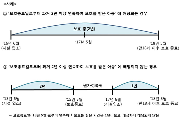 자립수당 지급 대상은 2017년 5월 이후 보호 종료된 아동 중 보호 종료일 기준 과거 2년 이상 연속해 보호를 받은 아동이다. 보호를 받은 이력이 없거나, 연령 조건에 미달되면 신청하더라도 대상에 제외된다.