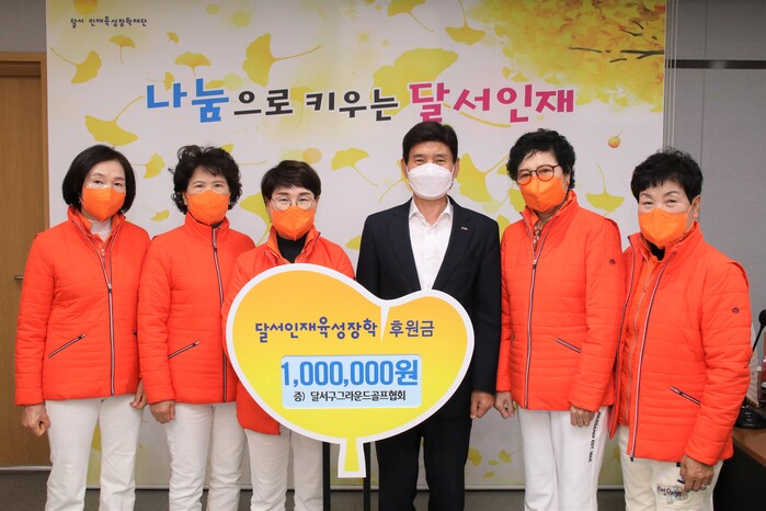[로컬세계=박세환 기자] 대구 달서구는 지난 24일 달서구그라운드골프협회에서 100만원, 이영자 회원님이 100만원을 후원금으로 지역 인재육성을 위해 써달라며 (재)달서인재육성장학재단에 전달했다고 밝혔다.