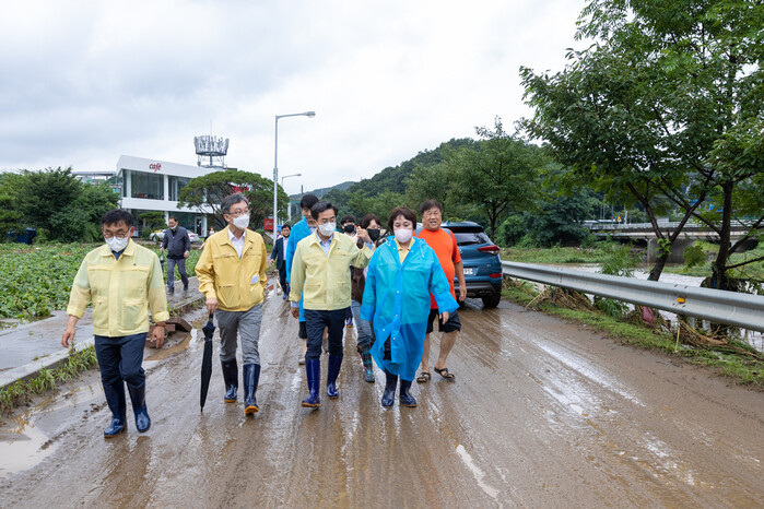 ▲김동연 경기도지사가 지난달 9일 용인시 고기동(고기교) 침수 현장 점검하고 있다. 경기도 제공 |
