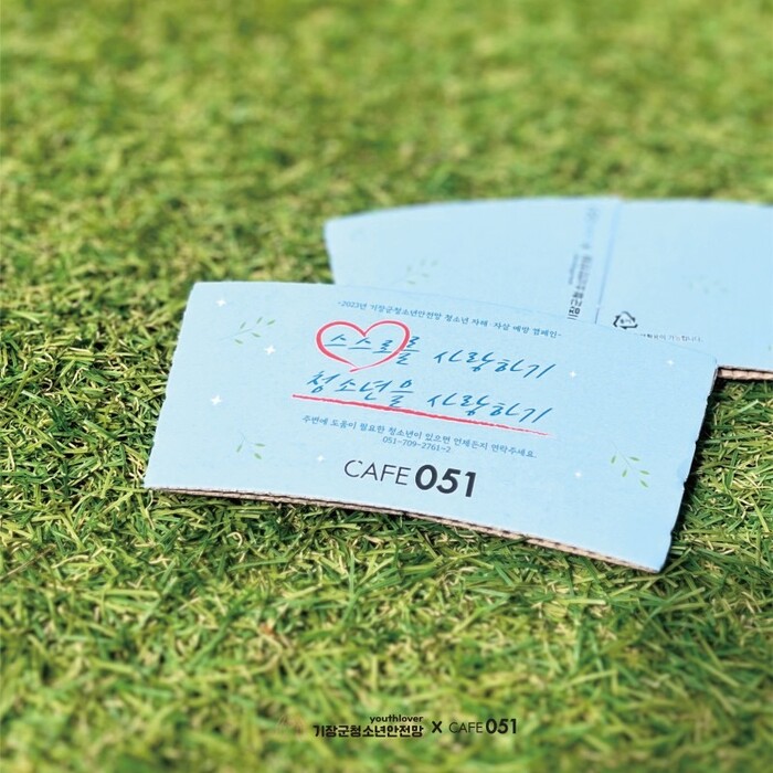 기장 지역 내 ‘카페051’ 6곳에서 캠페인 문구(스스로를 사랑하기, 청소년을 사랑하기)와 함께 도움이 필요한 청소년을 지원하는 기장군청소년안전망 연락처(☎ 051-709-2761~2)가 적힌 컵홀더를 제공한다.