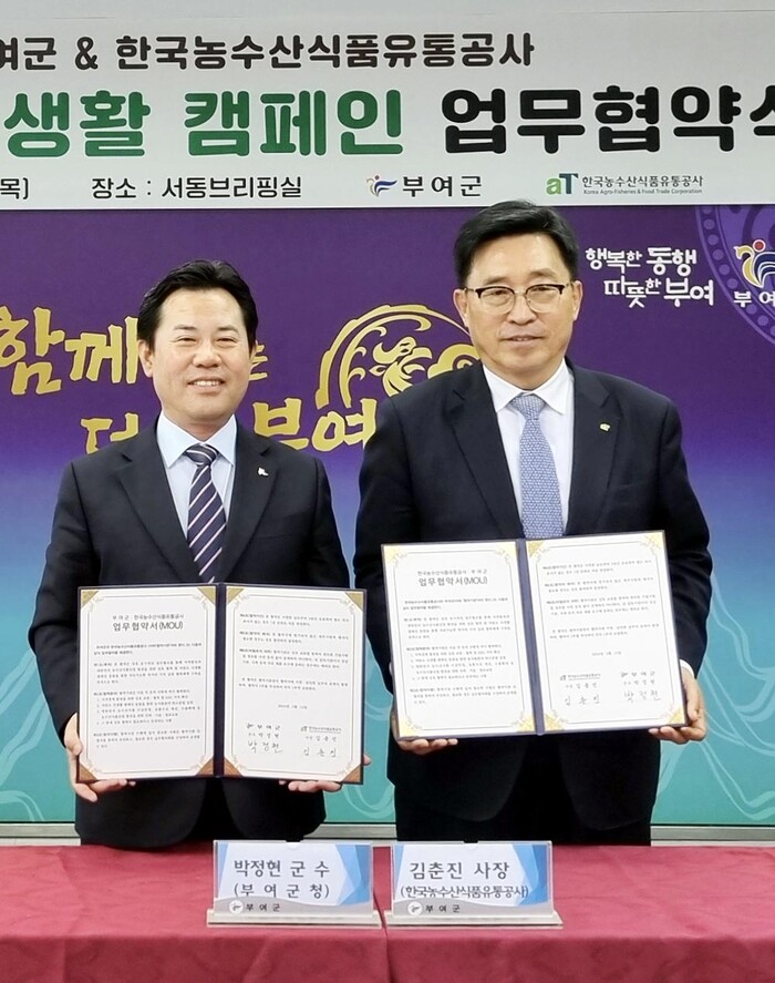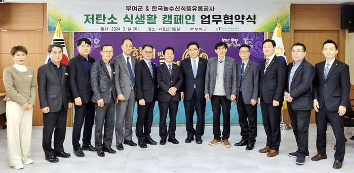 한국농수산식품유통공사(사장 김춘진)와 부여군(군수 박정현)은 14일 부여군청에서 저탄소 식생활 확산과 지역경제 발전을 위한 업무협약을 체결했다.