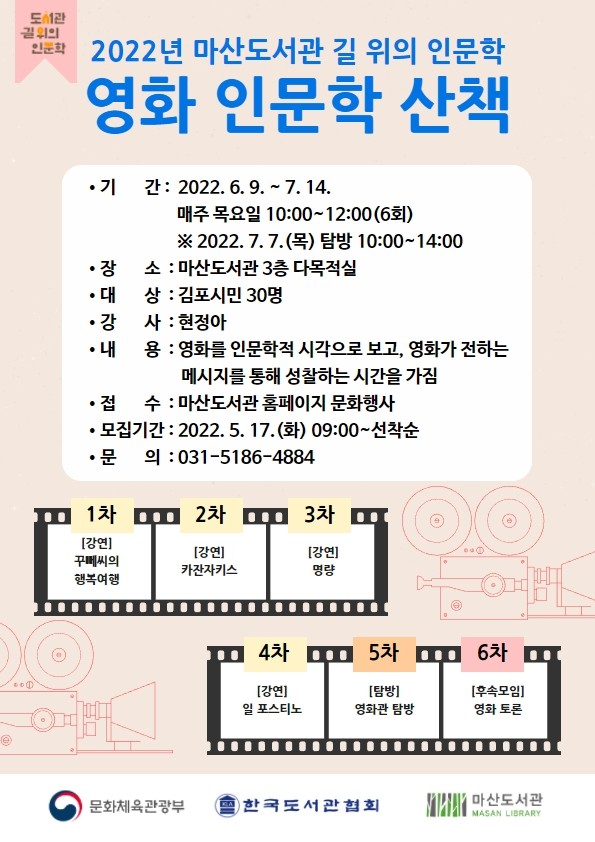 [로컬세계 김병민 기자]경기 김포시 마산도서관은 2022년 마산도서관 길 위의 인문학 ‘영화 인문학 산책’을 오는 6월 9일부터 7월 14일까지 마산도서관 3층 다목적실에서 6회에 걸쳐 운영한다.