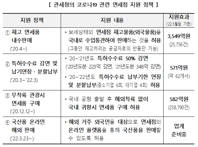 그간 관세청은 코로나19로 침체된 면세산업 지원을 위하여 재고면세품 내수판매, 특허수수료 분할납부·납기연장, 무착륙 관광비행시 면세품 판매 허용 등의 정책을 적극 펼쳤다.