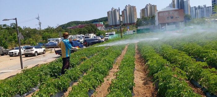 이번 관수 작업은 관내 저소득층 및 홀몸 어르신 등 어려운 이웃을 위해 기부할 예정인 감자와 태전동 아름다운 거리 조성 차원에서 식재한 꽃에 물을 주었다.