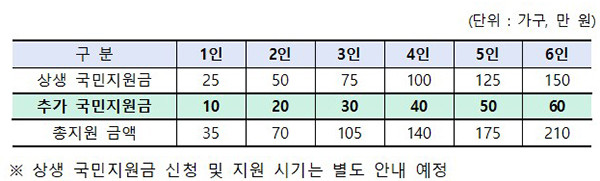 추가 국민지원금은 매달 기초생활보장 생계급여와 주거급여 및 아동양육비 등을 지원받고 있는 기존의 복지급여 계좌로 입금되며, 1인당 10만원씩 가구원 수에 따라 가구 단위로 지급된다.