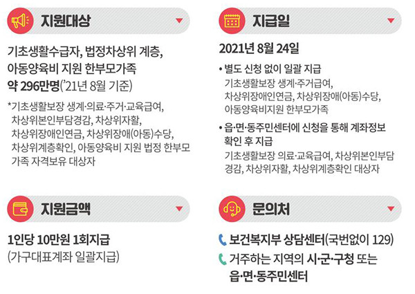 정부가 24일 저소득층 296만 명에게 1인당 10만원씩 추가로 기존 복지급여 계좌를 통해 국민지원금을 지급한다.