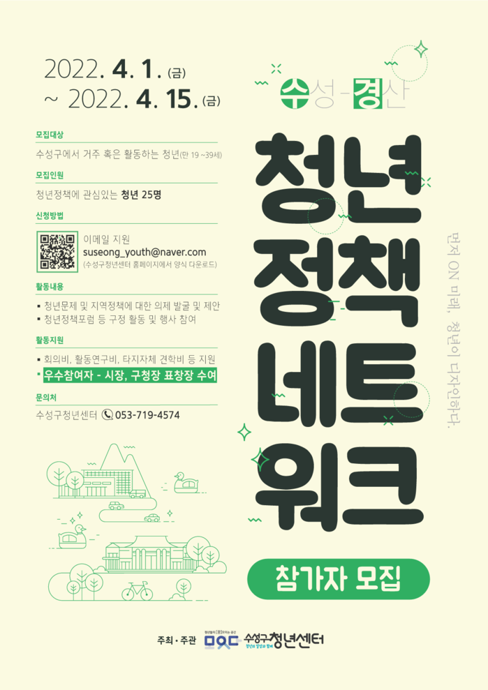수성구 25명, 경산 25명으로 총 50명을 모집할 계획이며 만 19세 이상 만 39세 청년이라면 누구나 지원 가능하다. 오픈테이블 토론, 타 지자체 청년단체 교류 등 다양한 활동에 참여할 수 있으며 활동비도 지원 받을 수 있다.