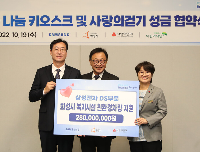 먼저 삼성전자 DS부문은 매년 개최하는 사랑의 걷기대회를 통해 모금한 성금을 앞으로 5년간 관내 사회복지기관과 단체, 시설에 친환경 차량 구입비로 지원하기로 했다.