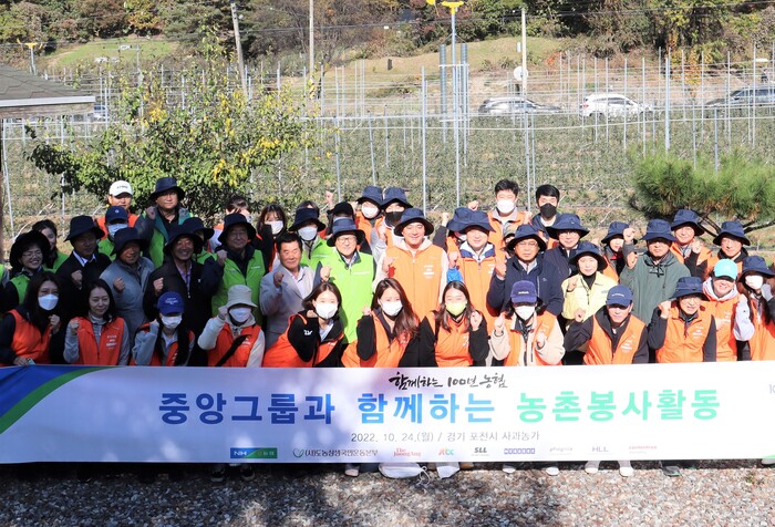 농협중앙회(회장 이성희)와 도농상생국민운동본부는 24일 중앙그룹과 함께 경기 포천시 영중면 사과농가를 찾아 '국민과 함께하는 농촌봉사활동'을 이어가며 수확기 바쁜 농촌에 일손을 보탰다.