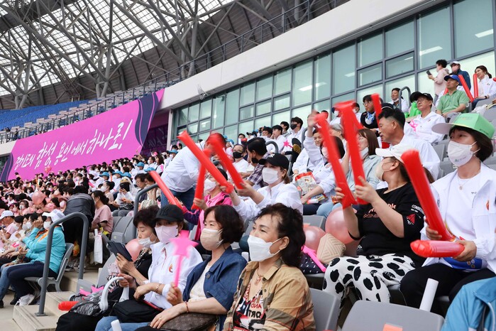성화 점화부터 다채로운 공연까지 볼거리가 가득했던 이날 행사에서 눈길을 끈 건 바로 무대와 관중석을 가득 메운 시민들이었다. 문화와 체육이 어우러진 대회를 만들기 위해 시는 도내 10개 시군에서 자발적으로 참여한 300여명의 합창단을 비롯해 용인시민 합창 자원봉사자 200명을 추가로 모집해 연합 합창단을 꾸렸다. 여기에 용인시립합창단과 용인시소년소녀합창단도 목소리를 더해 ‘경기도의 노래’, ‘승리의 노래’ 등을 다 함께 제창하며 웅장한 하모니를 만들어냈다.