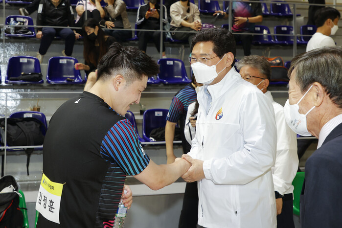 | ▲ 이상일 용인시장이 탁구 김정훈 선수와 인사를 나누고 있다. |