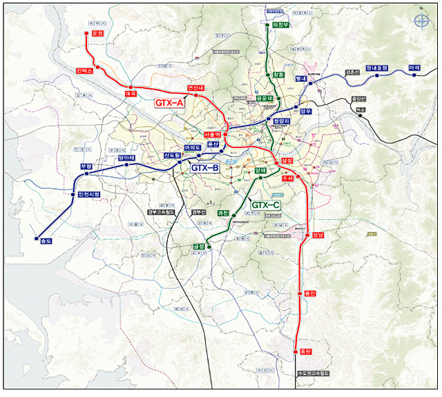 광역급행철도망(GTX)은 총 211km로서 파주와 동탄을 잇는 A노선(83km)과 송도와 마석을 연결하는 B노선(80km), 의정부와 금정을 잇는 C노선(48km) 등 3개 노선을 서울역, 청량리역, 삼성역을 주요 거점으로 해 방사형으로 교차되도록 구축할 계획이다.
