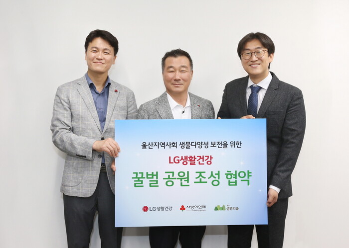 ▲LG생활건강 박헌영전무(가운데)와 손병일 사회복지공동모금회 팀장(왼쪽), 우성 울산생명의숲 국장(오른쪽)이 지난 31일 서울 LG광화문빌딩에서 협약식을 맺었다. |
