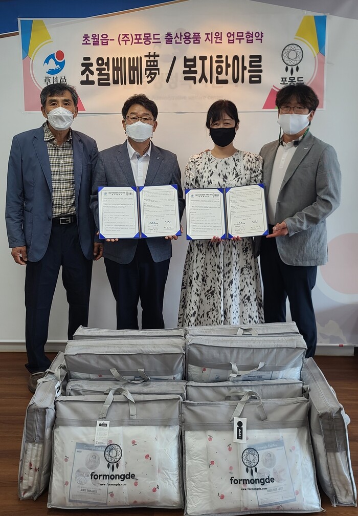 이날 협약의 첫걸음으로 포몽드는 250만원 상당의 침구 10세트를 기탁해 초월읍 관내 영유아 아동에게 소중히 쓰여질 계획이다.