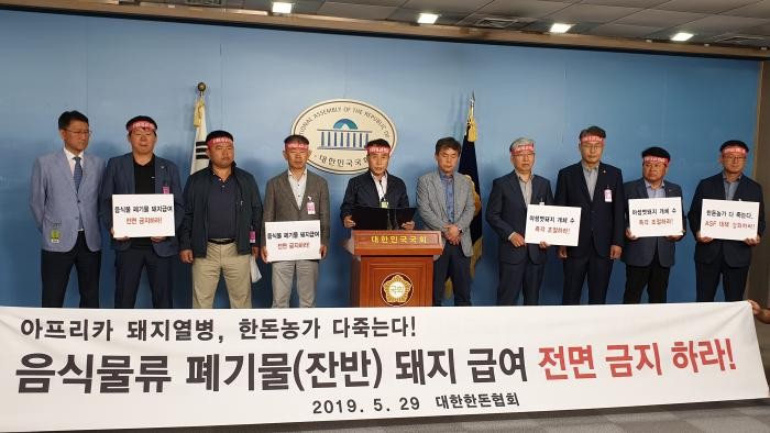▲지난달 29일 대한한돈협회(회장 하태식)와 김현권 더불어민주당 국회의원이 서울 여의도 국회 정론관에서 아프리카 돼지열병(ASF)관련 음식물류 폐기물 돼지 급여 전면 금지 촉구 기자회견을 하고 있다.(대한한돈협회 제공) |