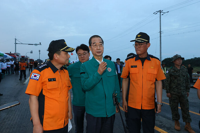 ▲ 한덕수 국무총리가 16일 미호천 제방 유실로 침수된 충북 청주시 오송읍 궁평2지하차도 현장을 찾아 상황을 점검하고 있다. (사진=국무조정실) |