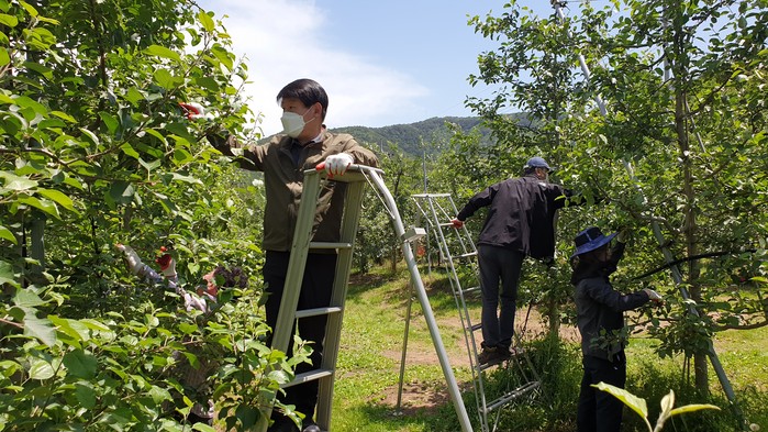 [로컬세계 박상진 기자]경북 의성군의회 사무과 직원 14명은 28일 옥산면 실업리 사과농가를 찾아 1200평의 과수원에서 사과 적과 작업을 도왔다.