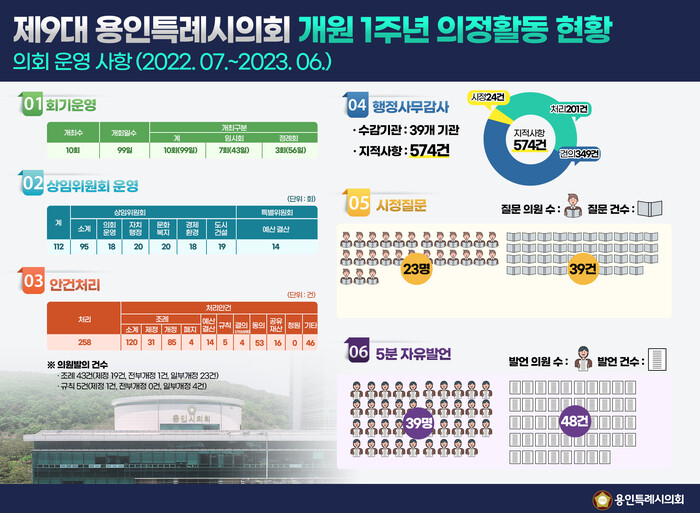 제9대 용인특례시의회는 개원 1년 동안 정례회 3회, 임시회 7회 등 총 10회를 개회해 조례안 120건, 예산‧결산안 14건, 공유재산안 16건, 동의안 53건, 결의안 4건, 규칙안 5건, 기타 46건 등 258건의 안건을 처리했다.