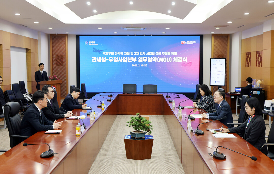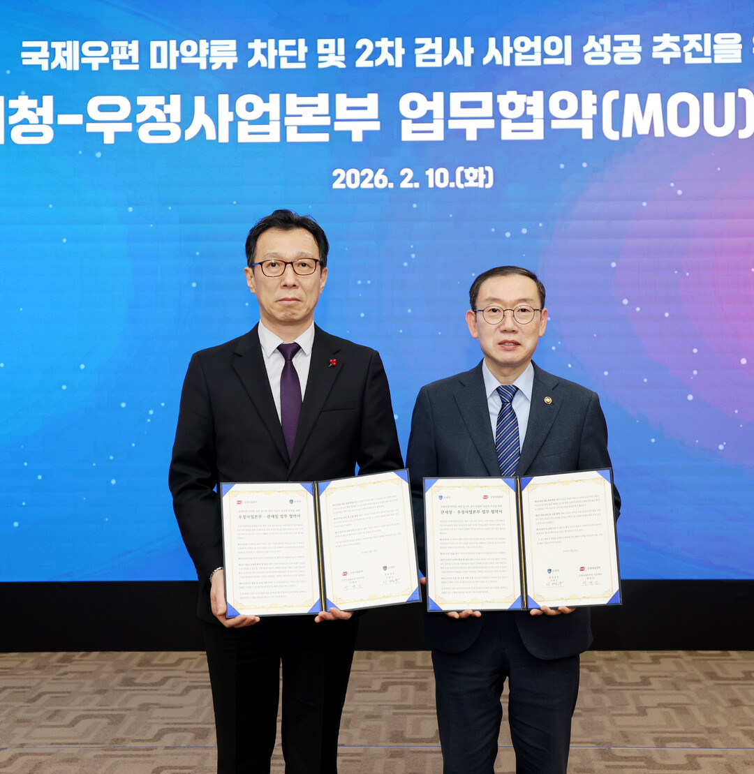 관세청(청장 이명구)과 과학기술정보통신부 우정사업본부(본부장 직무대리 곽병진)는 2월 10일(화) 서울세관에서 국제우편을 통한 마약류 반입을 원천 차단하기 위해 「국제우편 마약류 차단 및 2차 검사 사업의 성공 추진을 위한 업무협약 (MOU)」을 체결했다.