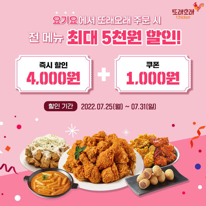 농협목우촌(대표이사 표기환)의 치킨 프랜차이즈 또래오래가 배달어플 요기요 주문고객을 대상으로 최대 5천원 할인 프로모션을 진행한다.