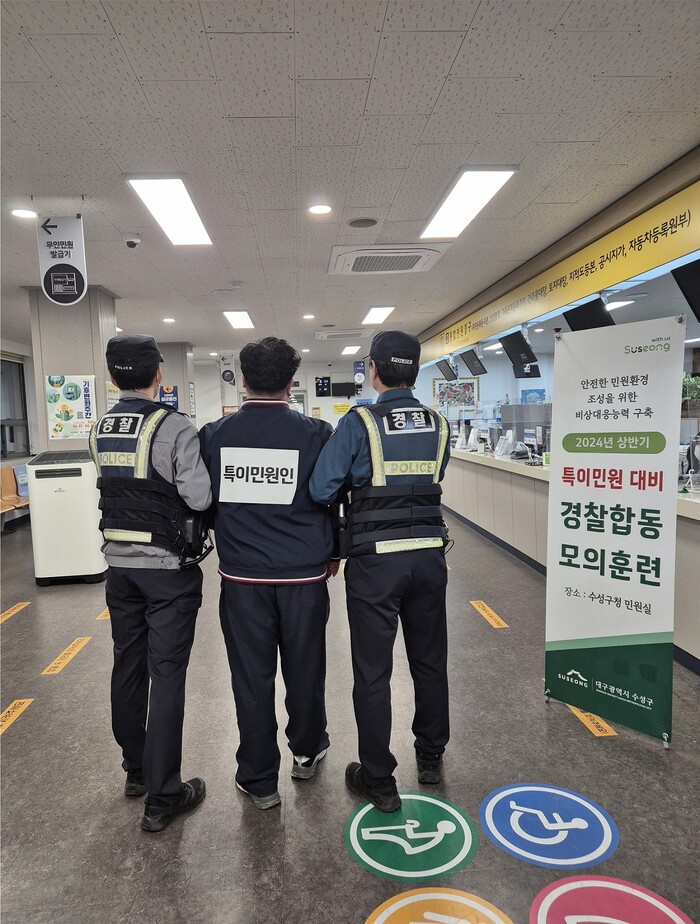 수성구 관내 23개 동 행정복지센터 민원실도 오는 5월까지 수성경찰서 관할 지구대 협조로 경찰합동 모의훈련을 실시한다. 하반기 비상 대응훈련은 7~8월경 실시할 예정이다.