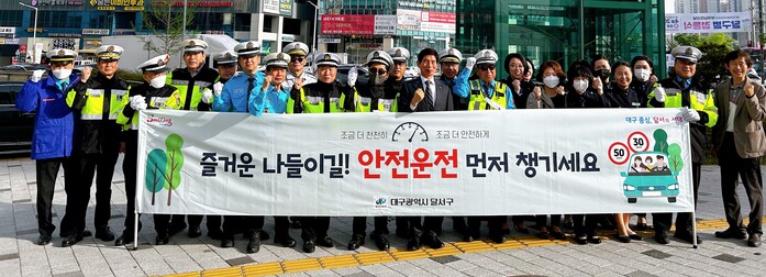 달서구는 이날 성서녹색어머니회, 성서모범운전자회 등 교통봉사단체와 성서경찰서, 구 직원 등 40여 명이 참여한 민‧관 합동 캠페인을 실시했다.