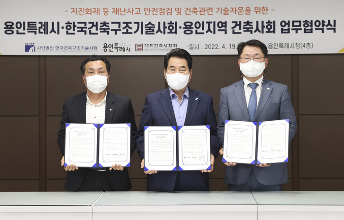 [로컬세계 김병민 기자]경기 용인시는 19일 한국건축구조기술사회, 용인지역 건축사협회 등 2곳의 단체와 ‘건축물 안전점검·기술자문 업무협약을 체결했다.