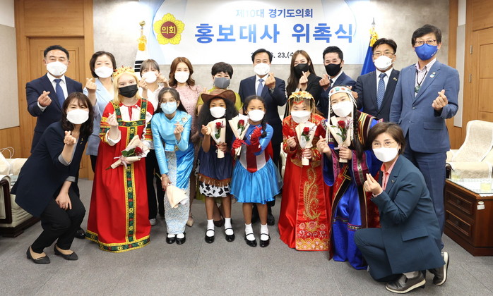 장현국 의장은 이날 오후 의장 접견실에서 가수 주미를 비롯해 가수 겸 유튜버 예빛, 영화배우 이원화, 탤런트 이가현 등 5명과 음악공연 전문단체 ‘아름드리 다문화합창단’ 등 1개 팀을 ‘제10대 경기도의회 신규 홍보대사’로 임명했다. 일정 관계로 불가피하게 위촉식에 불참한 가수 진시몬을 대신해 관계자에 위촉패와 임명장을 전달했다.