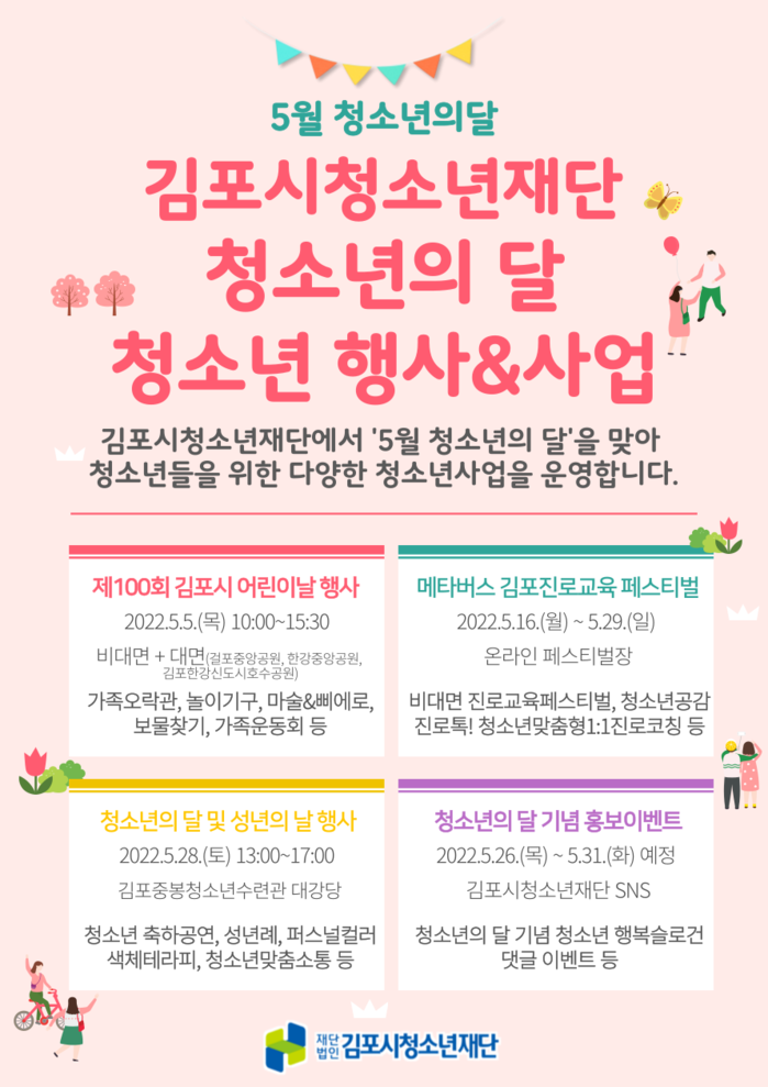 ‘5월 청소년의 달’을 맞아, ‘제100회 김포시 어린이날 행사’, ‘메타버스 김포진로교육 페스티벌’, ‘청소년의 달 및 성년의 날 행사’, ‘청소년의 달 기념 홍보이벤트’ 등 다양한 청소년행사를 운영하며, 권역별 청소년시설에서는 국가인증수련활동, 학교연계사업, 청소년문화활동 등 다채로운 청소년사업을 활발히 진행하고 있다.