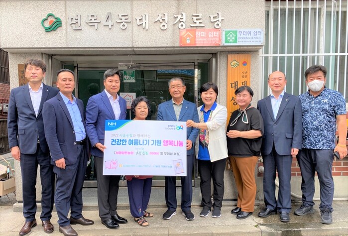 서울농협(본부장 황준구)은 29일 중랑구에 소재한 대성경로당을 방문해 무더위 속에 입맛을 잃고 기력이 떨어진 어르신들을 위해 서경양돈농협(조합장 이정배) 허브한돈 및 우리쌀 전달식을 갖고 어르신들의 건강을 기원하는 나눔행사를 개최했다.