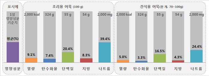 그 결과 21개 제품의 영양성분은 1회 섭취량(조리용 100g, 간식용 한 개)당 평균 열량이 하루 에너지 필요량보다 7.5%, 지방 함량도 하루 영양성분 기준치 대비 6.9%로 낮은 편인 반면 단백질 함량은 18.9%, 나트륨은 33.7%로 높은 수준을 보였다.