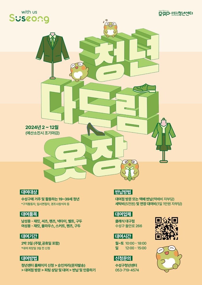 자세한 사항은 수성구청년센터 홈페이지 ‘청년 다드림 옷장’ 메뉴에서 확인할 수 있다.