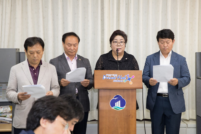 ▲3일 전북 군산시의회 의장단이 “군산전북대병원 건립을 차질없이 추진 할 것”을 촉구했다.(왼쪽 첫번째부터 나종성 경제건설위원회 위원장, 김경구 부의장, 박정희 의장, 김우민 운영위원회 위원장) |