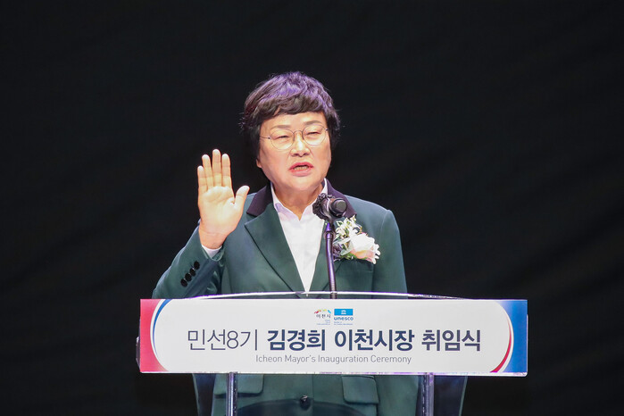 ▲김경희 이천시장이 1일 이천아트홀에서 열린 ‘민선 8기' 취임식에서 취임선서를 하고 있다. 이천시 제공 |