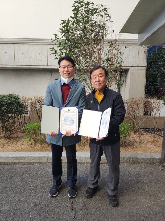 | ▲부산보훈청 부산제군센터 석경범(왼쪽) 기업협력팀장과 센텀메디칼관리위원회 김강남 관리실장이 14일 체결한 업무협약서를 들어보이며 기념촬영을 하고 있다. 부산보훈청 제공 |