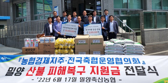 농협(회장 이성희)경제지주 축산경제는 17일 경남 밀양축협 본점에서 최근 산불 피해를 입은 밀양지역 축산농가에 총 3천만원 규모의 복구지원금을 전달했다고 밝혔다.