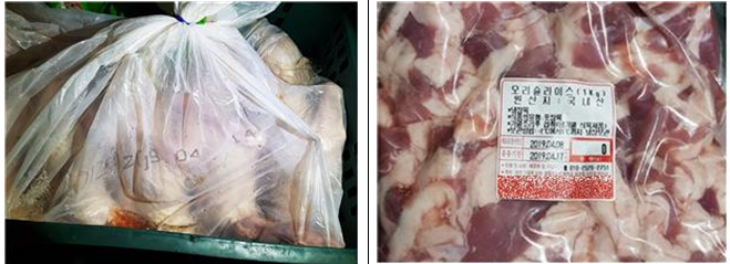 ▲유통기한이 2019년 4월 14일인 원료육으로 2019년 4월 17일까지인 포장육을 생산함으로서 유통기한을 3일 연장했다. 사진은 (좌)원료육과 (우) 원료육 이용 생산 포장육.(식약처 제공) |