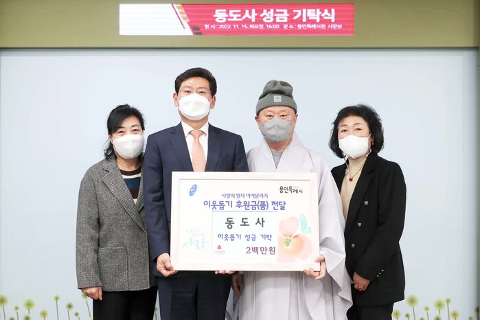 시는 15일 동도사 주지 도원스님과 관계자 3명이 이상일 용인특례시장실을 찾아와 성금 200만원을 기탁했다고 밝혔다.