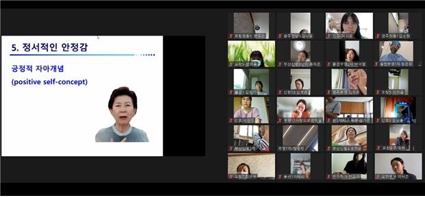 ▲이기숙 부영그룹 상임고문이 어린이집 부모들을 대상으로 온라인 화상 교육을 실시하고 있다. |