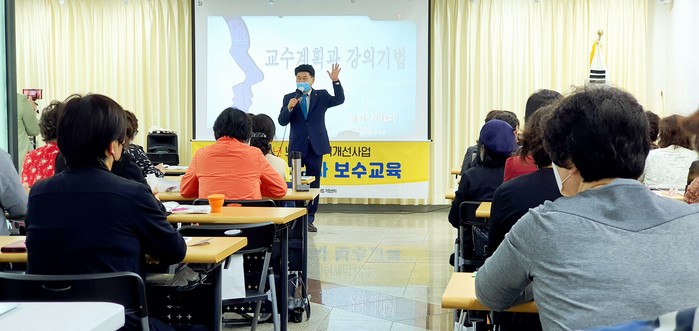 ▲김원기 부의장이 13일, 의정부역 지하상가 서부광장 문화공간에서 열린 ‘경기도 성(性)인식 개선사업 보수교육’ 과정에 참여하고 있는 성(性)교육 강사를 대상으로 ‘강의스킬 및 이미지 메이킹’에 관한 주제로 강의를 하고 있다.(경기도의회 제공) |