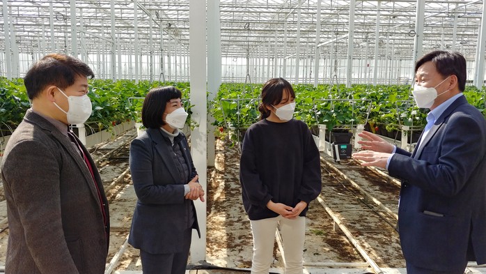 ▲업무협약 후 스마트팜 농장 방문하여 대표로부터 설명을 듣고 있다.(왼쪽부터 윤두현 원스베리 대표, 고은주 농협구례교육원 팀장, 서수원 스마트베리팜 대표, 기영윤 농협구례교육원장) |