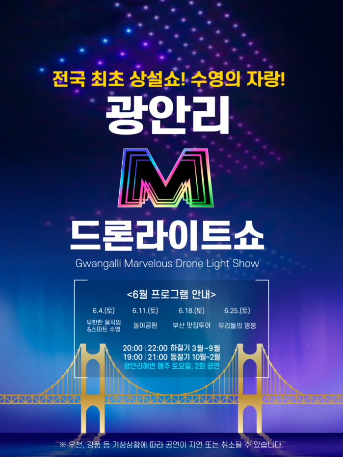 4일에 열릴 6월 첫 공연은 ‘무한한 움직임 & 스마트 수영’의 주제로 시작돼 인공지능, AR, VR 등 기하학적인 콘텐츠를 멋지게 선보인다. 이어 6월 11일 ‘놀이공원’, 6월 18일 ‘부산 맛집투어’, 6월 25일 ‘우리들의 영웅’ 주제의 드론쇼로 관람객들의 눈을 사로잡을 예정이다.