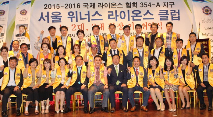 ▲10일 서울 공항컨벤션 웨딩홀에서 열린 서울 위너스 라이온스클럽 회장 이취임식에서 회원들이 기념촬영을 하고 있다. |