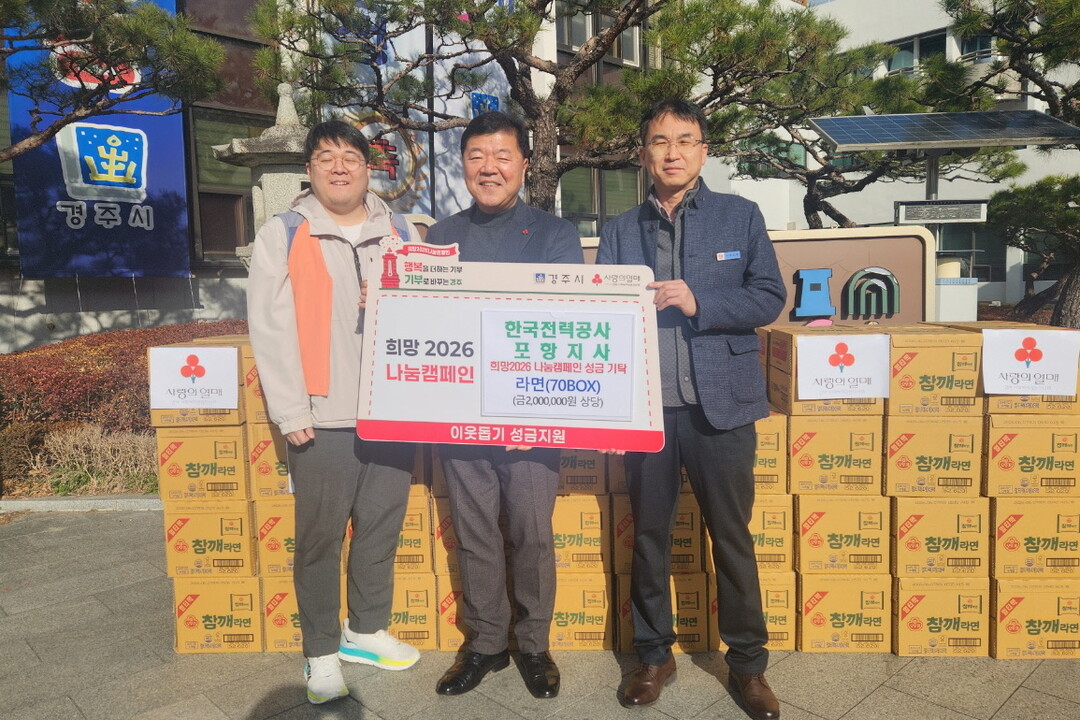 [로컬세계 = 박종순 기자] 한국전력공사 포항지사는 연말연시를 맞아 지역 내 취약계층을 돕기 위해 라면 70박스(200만 원 상당)를 기부하며 따뜻한 나눔을 실천했다.